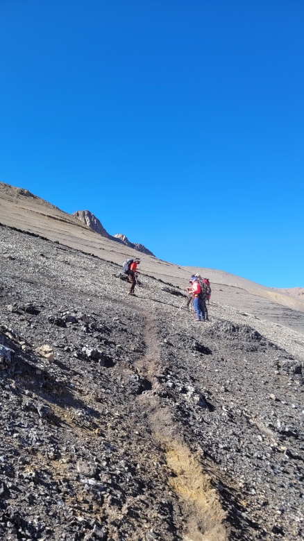 En la mañana nos trasladamos en los vehículos particulares hasta “Los Tachos”, ubicado a 2500 mts de altura. Iniciamos el ascenso hasta el Campamento 1, ubicado a 3000msnm – conocido como “vivac Huechulafquen”- caminando por un hermoso y árido valle.