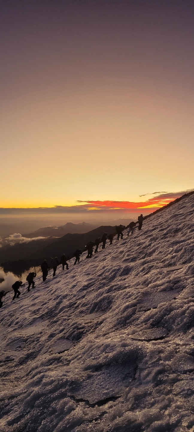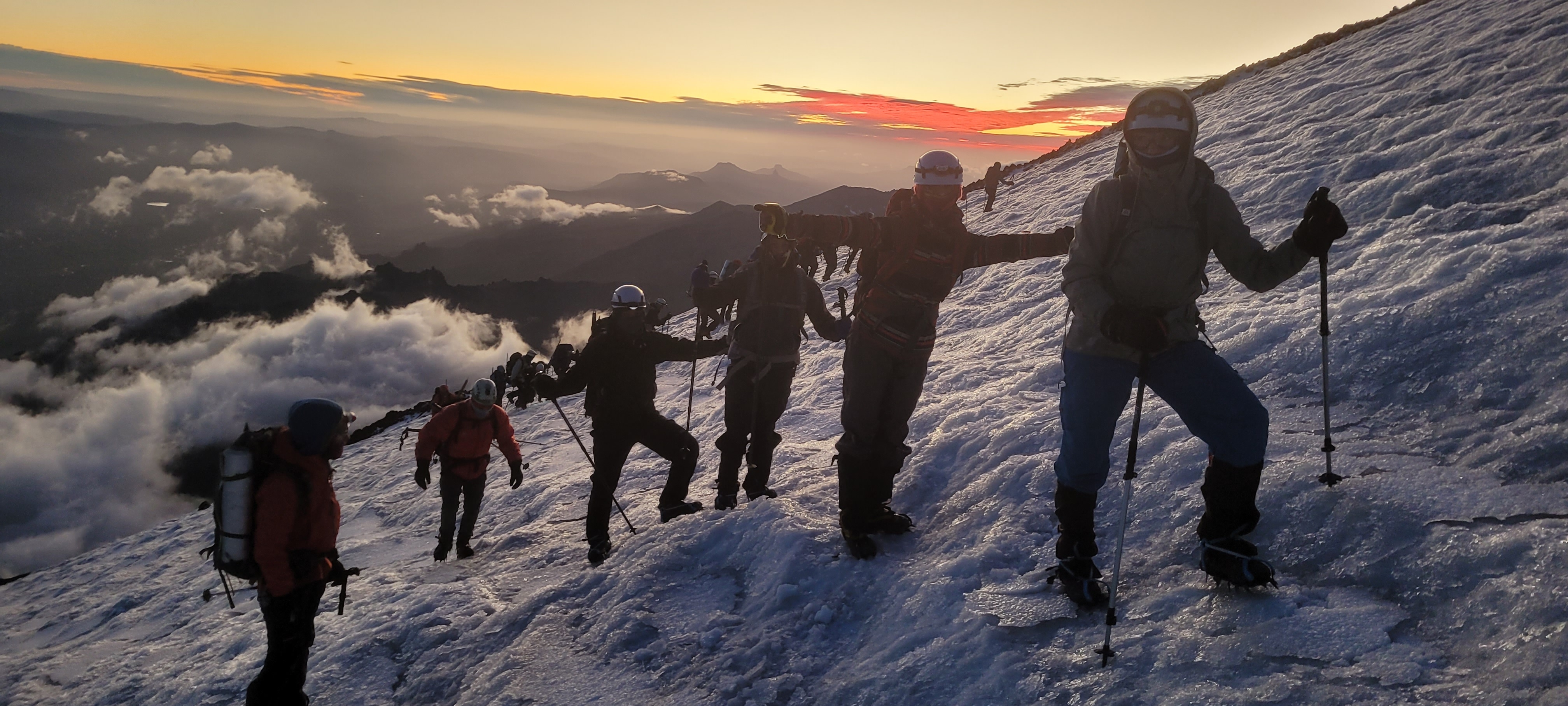 Normalmente el guía de montaña nos despierta a las 2 de la mañana, desayunamos, preparamos el equipo necesario y comenzamos a caminar en ascenso de noche con las linternas frontales. En este día el trayecto es más técnico, se transita por el costado del glaciar, caminando por nieve congelada, utilizando crampones, bastones y piqueta. A mitad de caminos veremos el amanecer desde las alturas… uno de los tantos momentos mágicos que nos regalara el volcán.